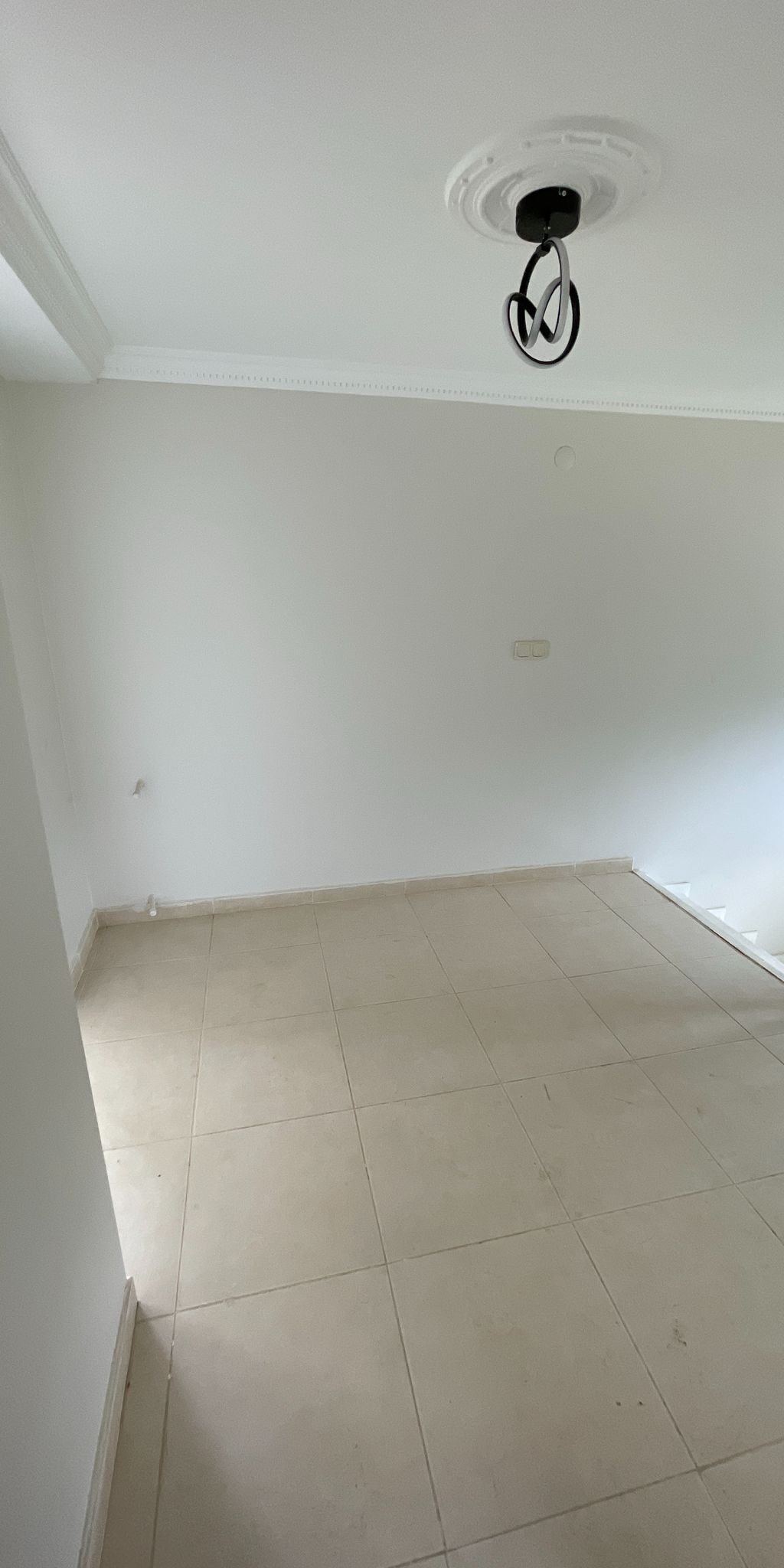 Other bedrooms continue the neutral palette — beige floors, white walls, and minimal decoration. This neutrality gives future owners the freedom to apply their own style without renovation. The ceiling continues the decorative molding pattern, linking all floors visually.