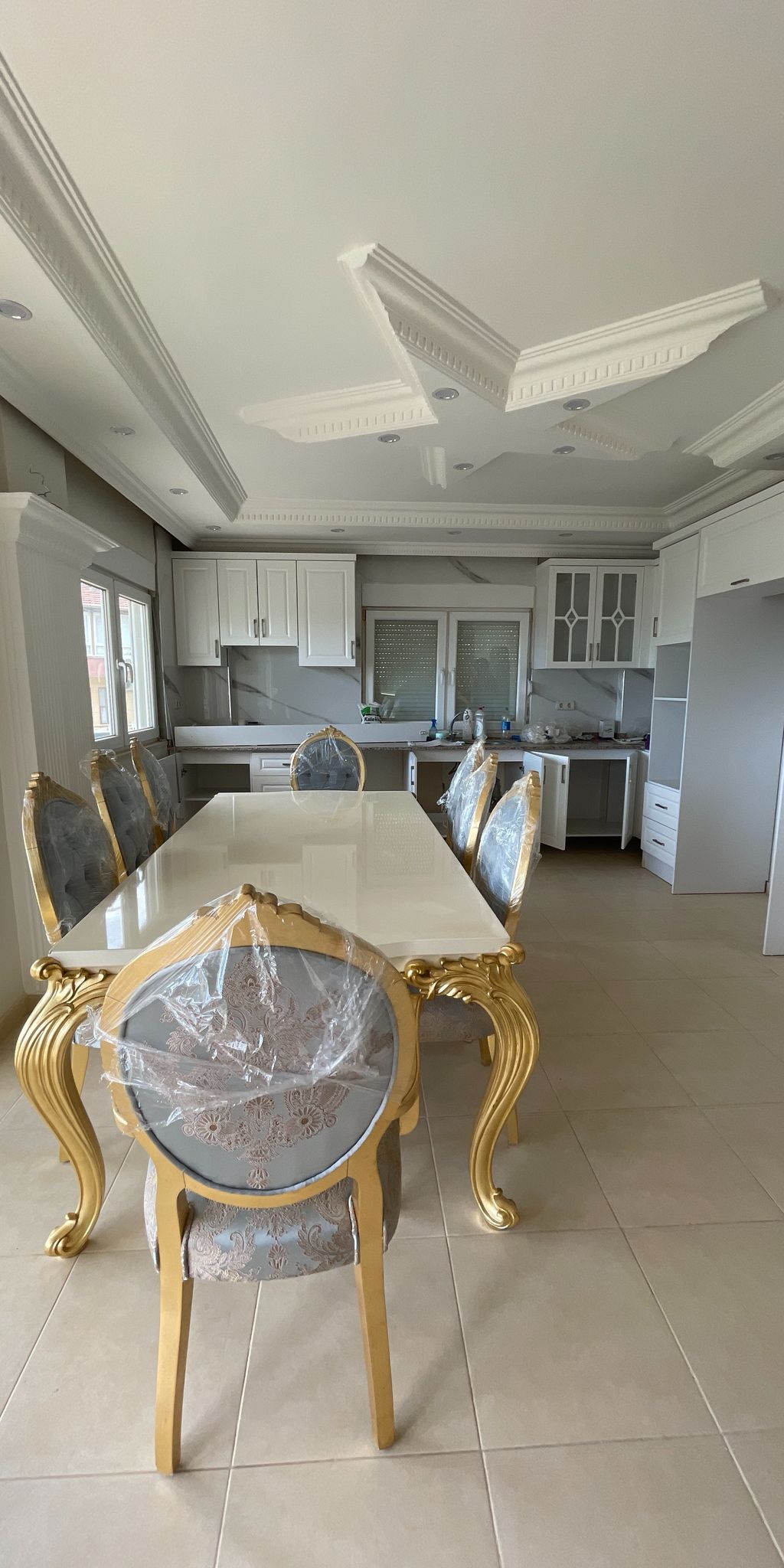 Furniture in this section follows a classic line, with golden accents and carved details. The dining table, framed by upholstered chairs, gives a formal tone. The lighting design includes ceiling borders with embedded spotlights that create soft, symmetrical illumination. Together with the ceiling panels, these details build visual order and a sense of craftsmanship.