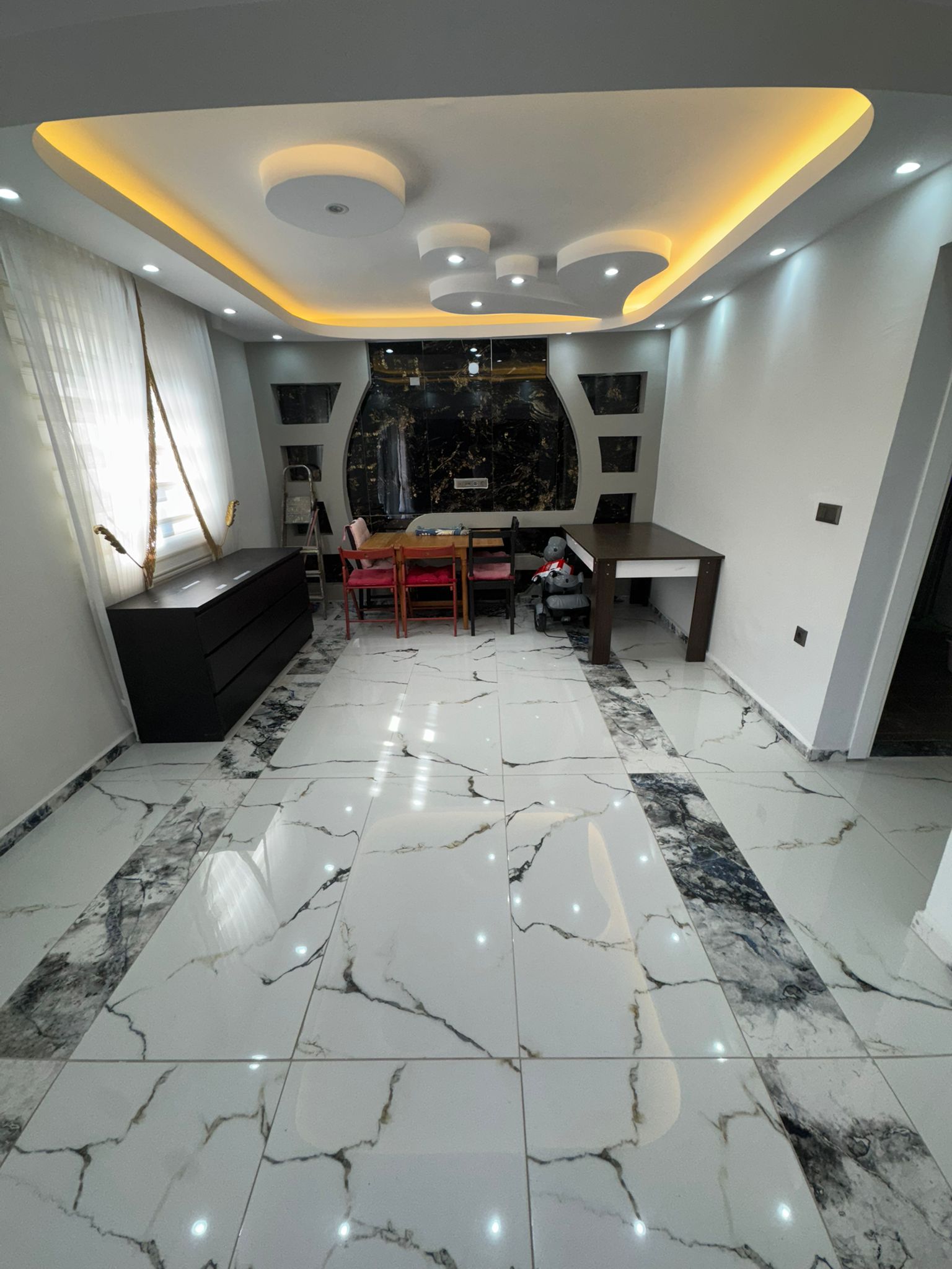 The living room forms the heart of this alanya villa for sale. It’s large, bright, and arranged for easy movement between seating, dining, and terrace. Cream-toned sofas and neutral walls allow light to dominate. The reflective floor gives a sense of openness, while wide windows bring in sun from morning to afternoon.