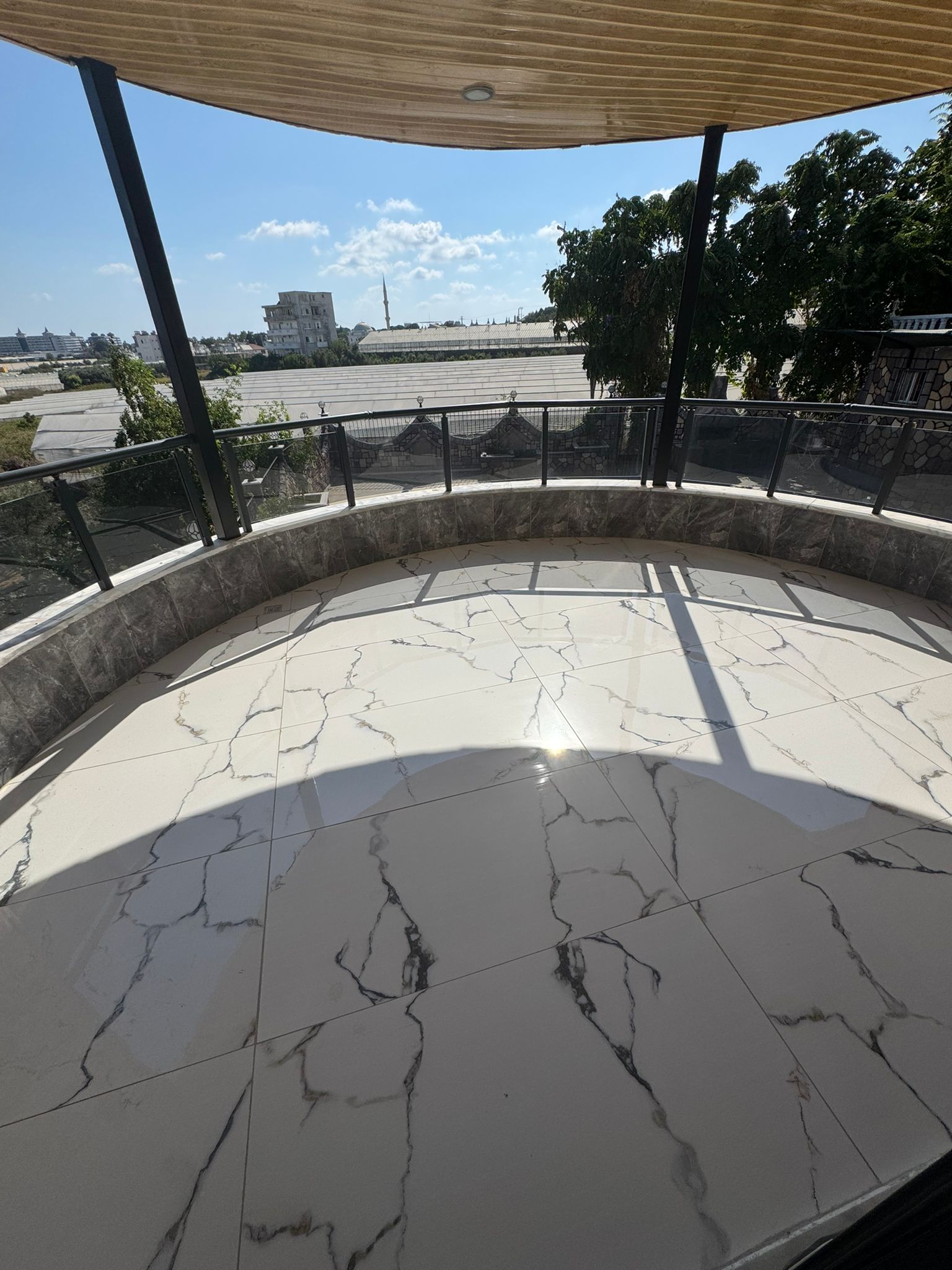 The upper floor opens to semi-oval balconies facing the sea. From here, the view stretches toward the shoreline and surrounding hotels. Because the property stands slightly elevated, the scenery remains open. Flooring continues the same marble pattern as inside, ensuring a sense of unity. These balconies are wide enough for chairs and small tables—comfortable spaces to pause and watch the evening light.