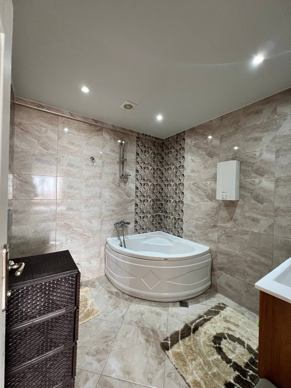 Ванна кімната оздоблена плиткою під мармур. Головна особливість — кутова джакузі, рідкість для квартир такого розміру. Продумане освітлення та оздоблення створюють стиль «доступної розкоші».