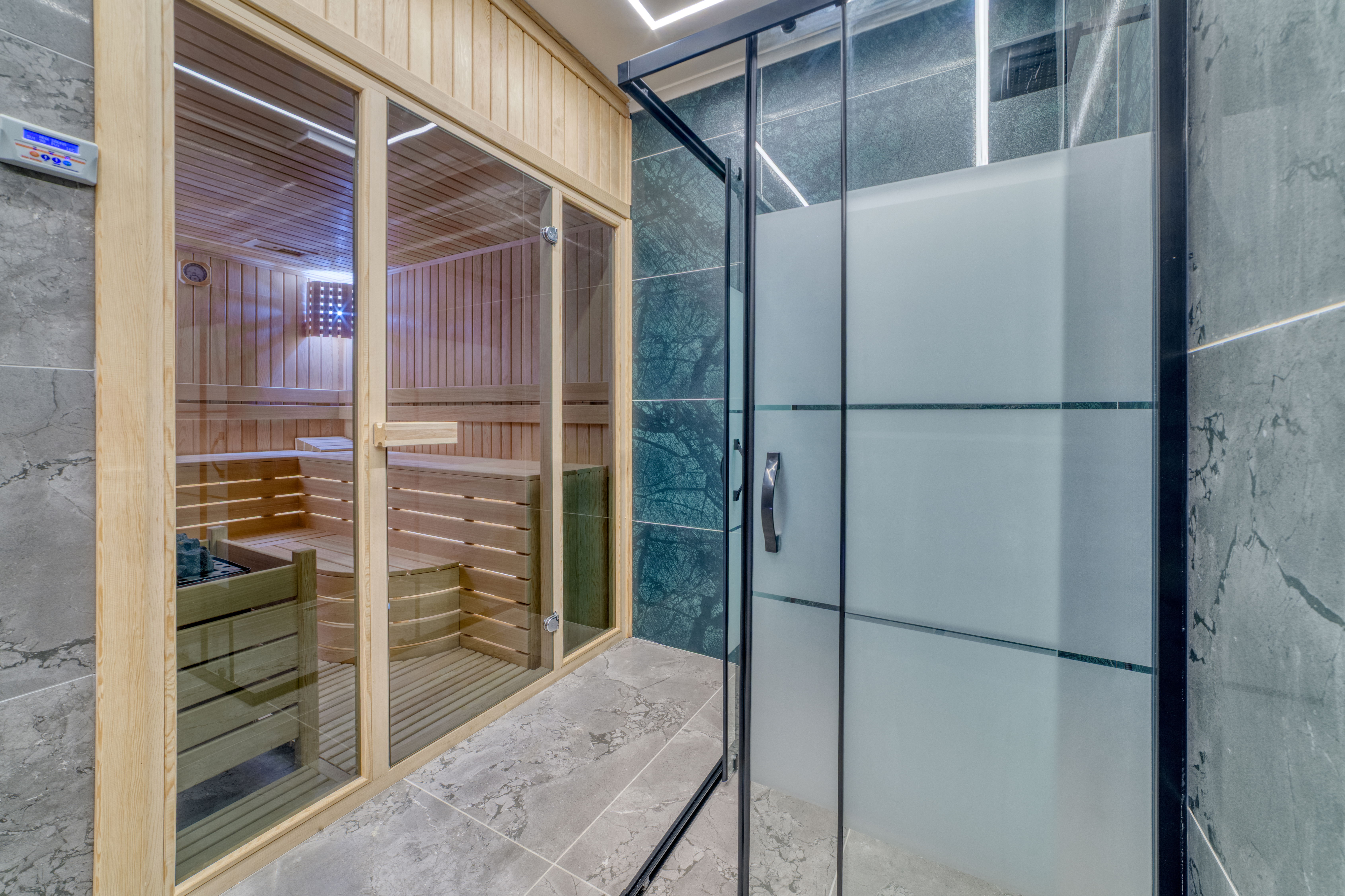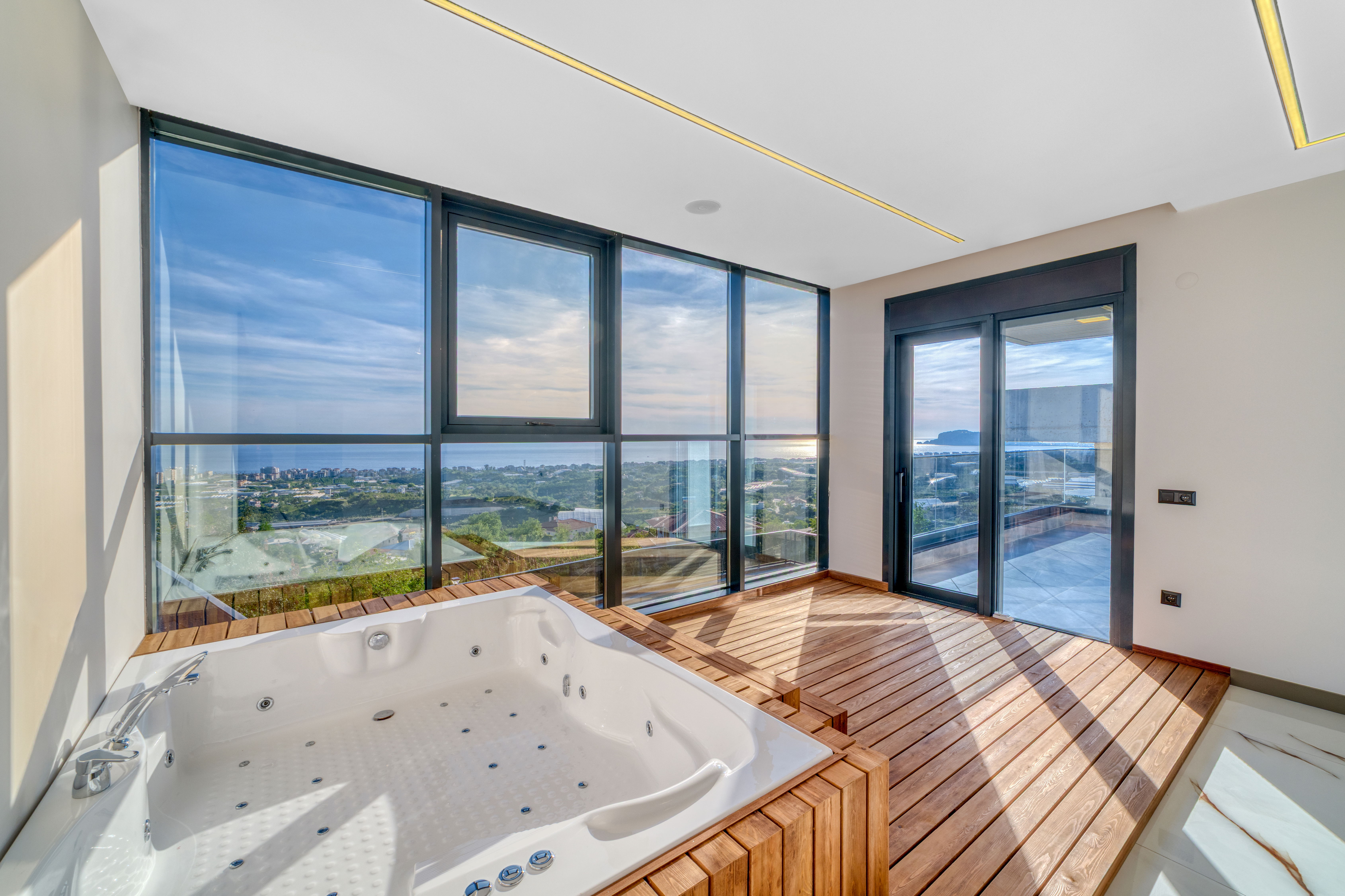 Дерев’яна підлога під ванною додає тепла до холодного мармуру. Освітлення мінімальне; тонкі LED-лінії окреслюють стелю, залишаючи головний акцент на краєвиді.