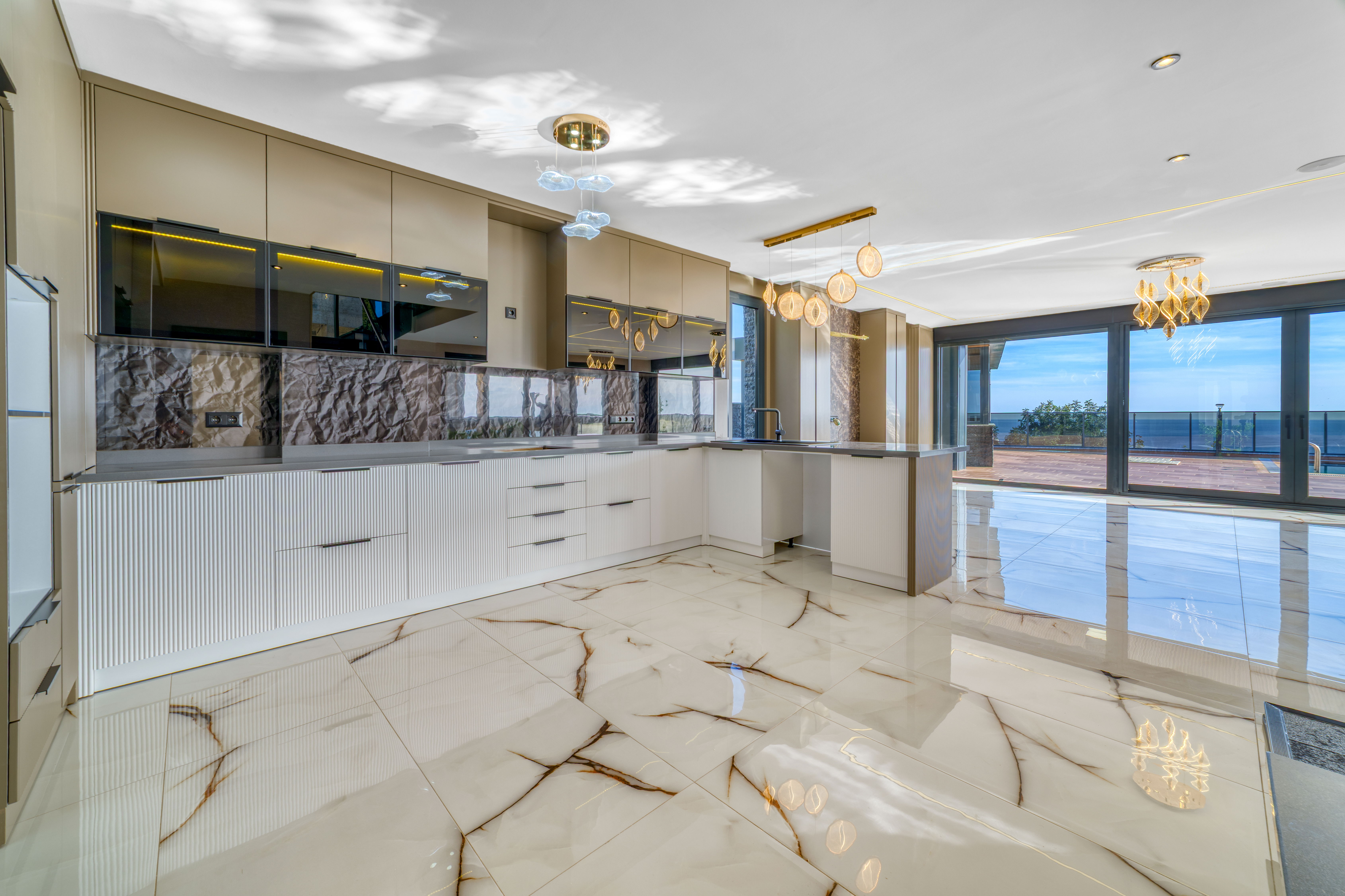 Всередині головну роль відіграє світло. Високі стелі й великоформатна плитка під мармур створюють яскравий, безперервний простір. Відблиски на підлозі подвоюють відчуття масштабу. Світильники із золотавим відтінком додають тепла без надмірності.